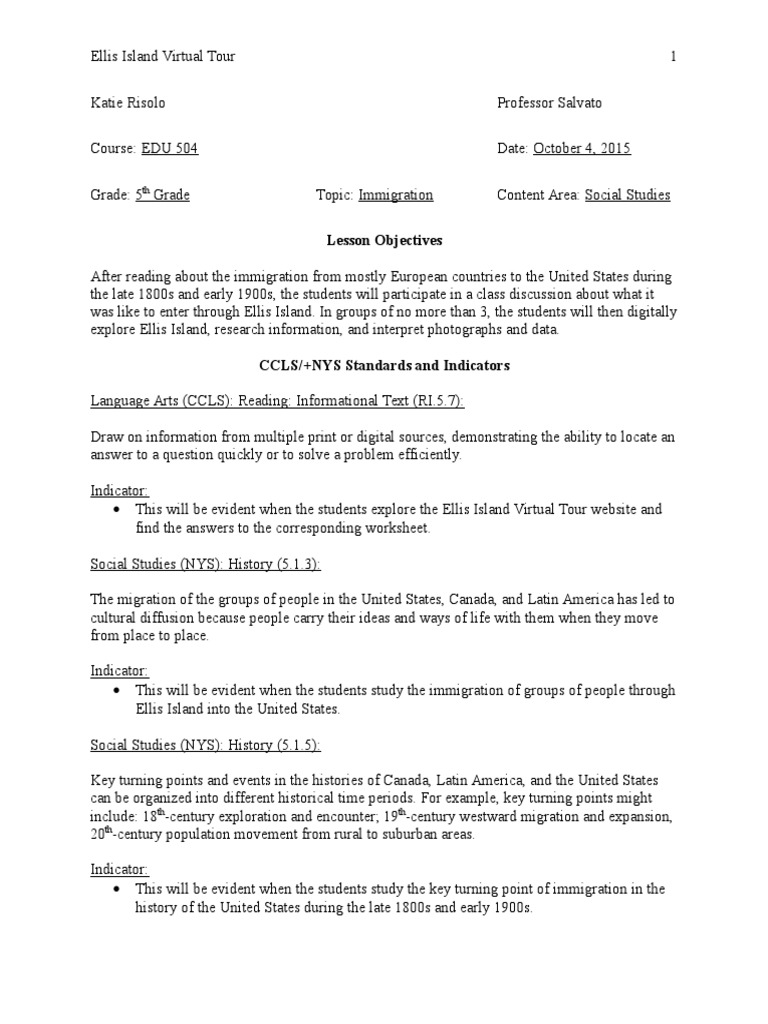 ellis island virtual tour lesson plan Learning Teaching